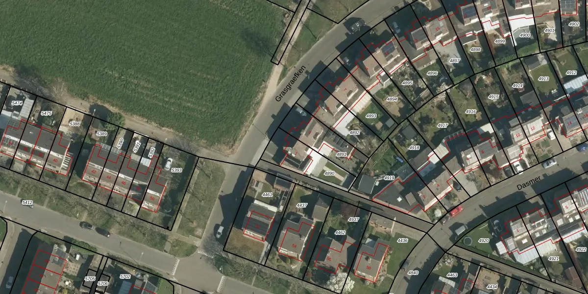 Grasgraefken 1 is gelegen op kadastraal perceel STE00B4890. Deze kadastrale aanduiding is uniek en wordt gebruikt door het Kadaster om eigendomsrechten en andere zakelijke rechten vast te leggen. Het perceel maakt onderdeel uit van de kadastrale gemeente Stein.