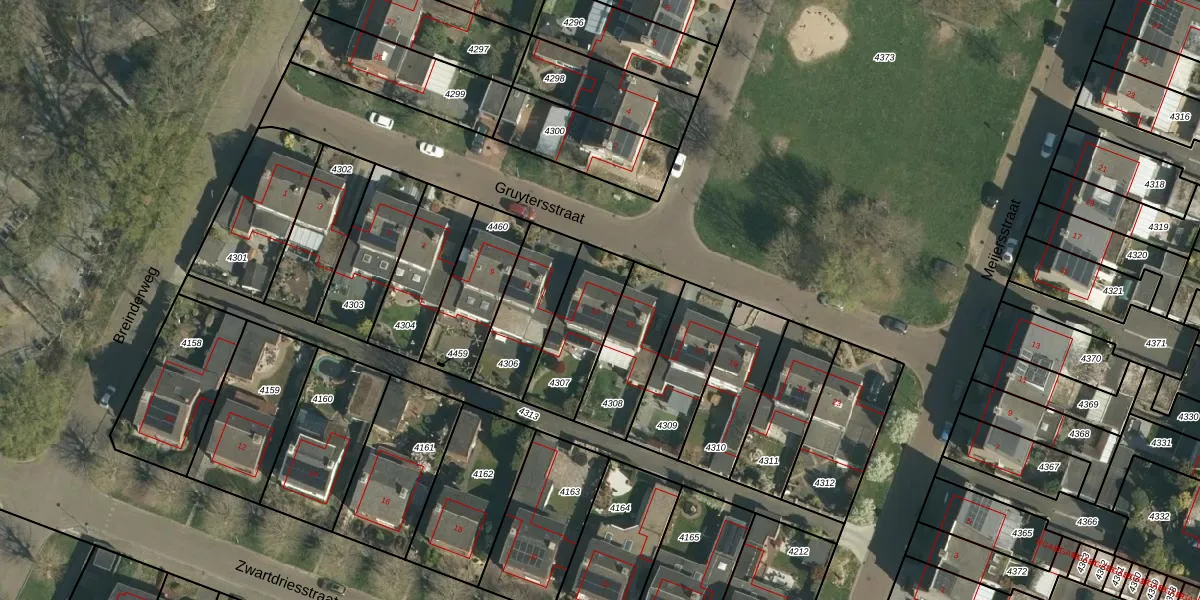 Gruytersstraat 13 is gelegen op kadastraal perceel STE00B4307. Deze kadastrale aanduiding is uniek en wordt gebruikt door het Kadaster om eigendomsrechten en andere zakelijke rechten vast te leggen. Het perceel maakt onderdeel uit van de kadastrale gemeente Stein.