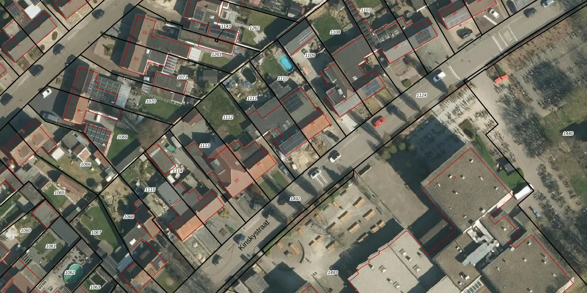 Kinskystraat 14 is gelegen op kadastraal perceel STE00F1111. Deze kadastrale aanduiding is uniek en wordt gebruikt door het Kadaster om eigendomsrechten en andere zakelijke rechten vast te leggen. Het perceel maakt onderdeel uit van de kadastrale gemeente Stein.