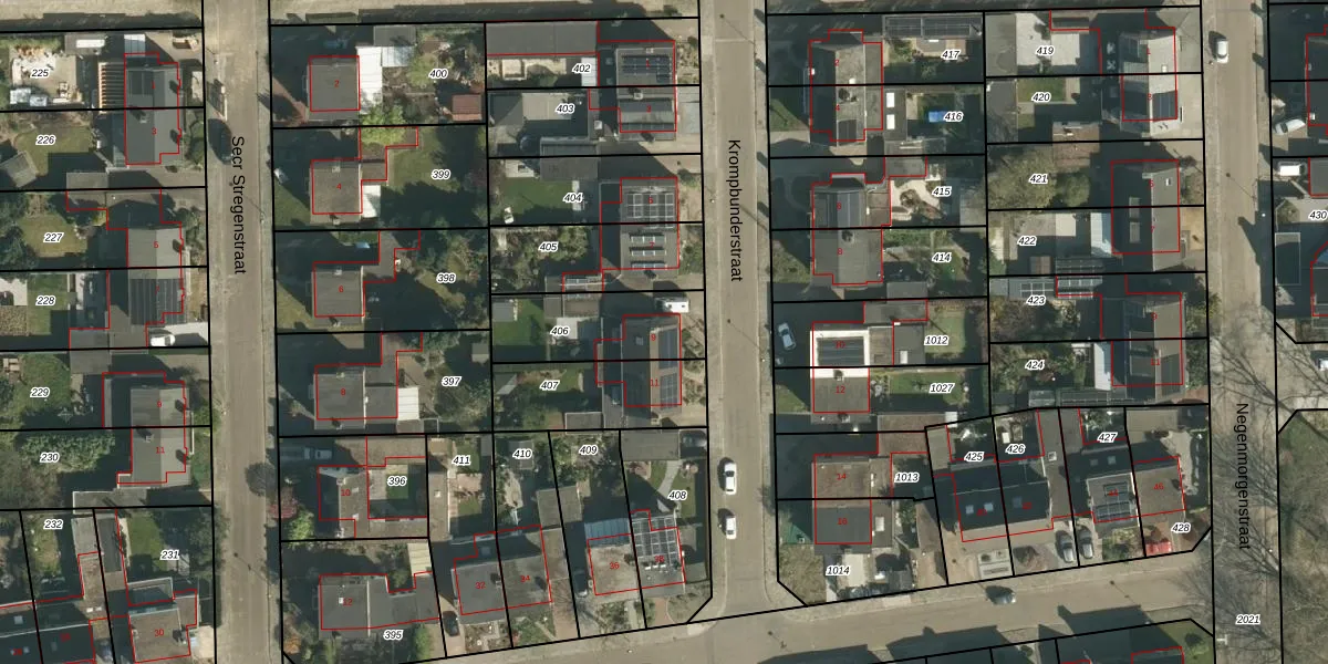Het perceel waarop Krompbunderstraat 9 staat heeft een oppervlakte van 335 m². Dit is een groot perceel. De perceeloppervlakte wordt geregistreerd door het Kadaster. Gedetailleerde informatie over de maten van dit perceel kunt u vinden in het rapport Kadastrale kaart met maatvoering van Krompbunderstraat 9.