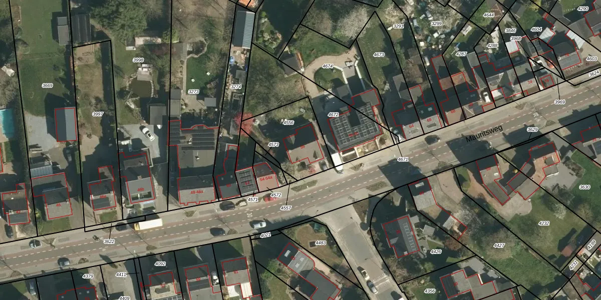 Het perceel waarop Mauritsweg 56 staat heeft een oppervlakte van 485 m². Dit is een groot perceel. De perceeloppervlakte wordt geregistreerd door het Kadaster. Gedetailleerde informatie over de maten van dit perceel kunt u vinden in het rapport Kadastrale kaart met maatvoering van Mauritsweg 56.