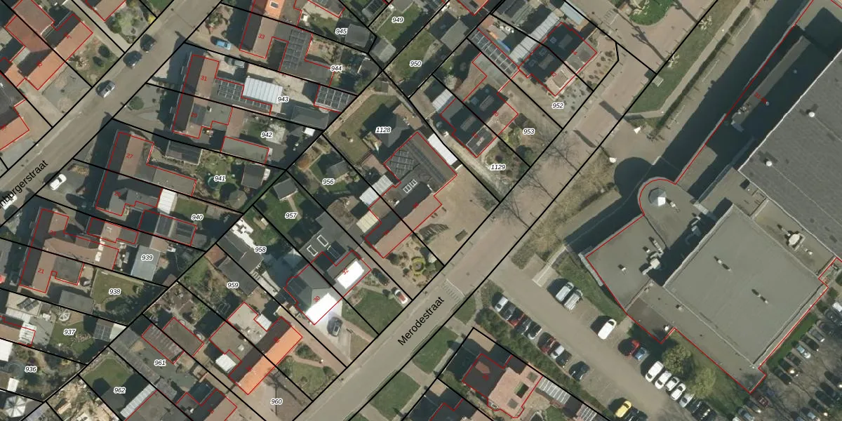 Merodestraat 36 is gelegen op kadastraal perceel STE00F1128. Deze kadastrale aanduiding is uniek en wordt gebruikt door het Kadaster om eigendomsrechten en andere zakelijke rechten vast te leggen. Het perceel maakt onderdeel uit van de kadastrale gemeente Stein.