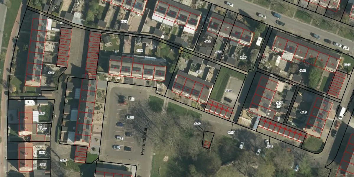 Het perceel waarop Pennersstraat 24 staat heeft een oppervlakte van 665 m². Dit is een groot perceel. De perceeloppervlakte wordt geregistreerd door het Kadaster. Gedetailleerde informatie over de maten van dit perceel kunt u vinden in het rapport Kadastrale kaart met maatvoering van Pennersstraat 24.