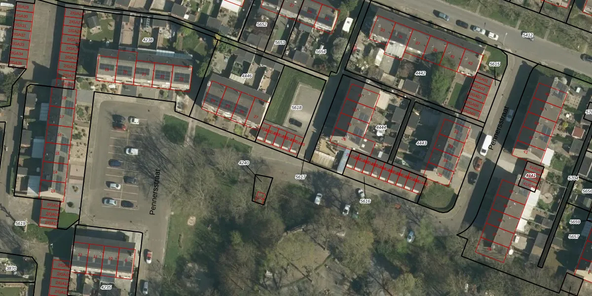 Het perceel waarop Pennersstraat 27-GA05 staat heeft een oppervlakte van 417 m². Dit is een groot perceel. De perceeloppervlakte wordt geregistreerd door het Kadaster. Gedetailleerde informatie over de maten van dit perceel kunt u vinden in het rapport Kadastrale kaart met maatvoering van Pennersstraat 27-GA05.