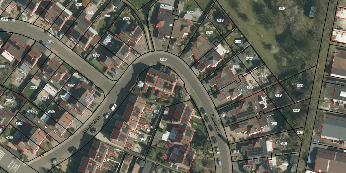 Het perceel waarop Salmansleen 25 staat heeft een oppervlakte van 2428 m². Dit is een zeer groot perceel. De perceeloppervlakte wordt geregistreerd door het Kadaster. Gedetailleerde informatie over de maten van dit perceel kunt u vinden in het rapport Kadastrale kaart met maatvoering van Salmansleen 25.