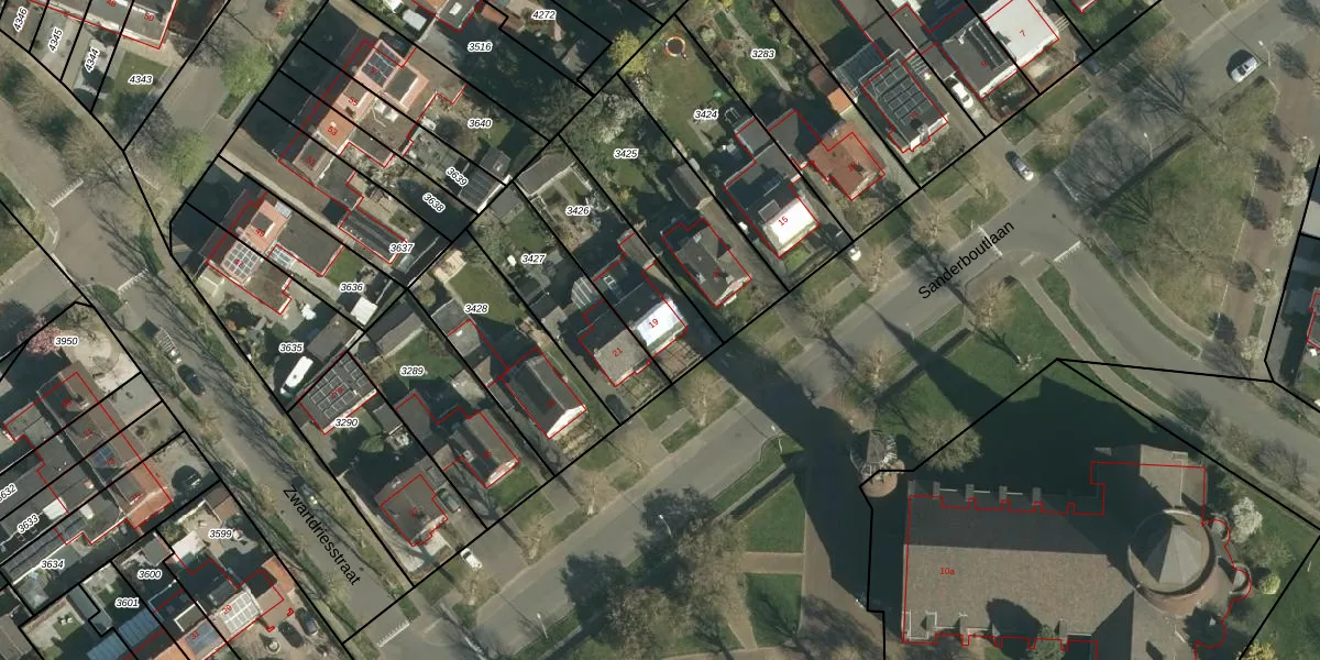 Sanderboutlaan 19 is gelegen op kadastraal perceel STE00B3426. Deze kadastrale aanduiding is uniek en wordt gebruikt door het Kadaster om eigendomsrechten en andere zakelijke rechten vast te leggen. Het perceel maakt onderdeel uit van de kadastrale gemeente Stein.