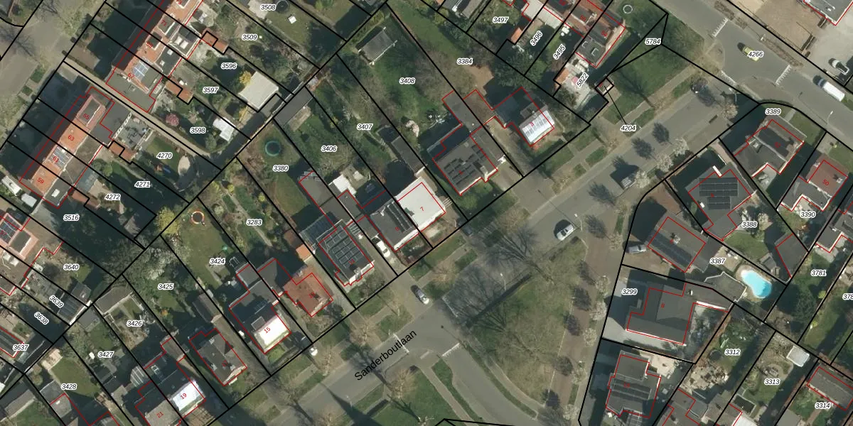Sanderboutlaan 7 is gelegen op kadastraal perceel STE00B3407. Deze kadastrale aanduiding is uniek en wordt gebruikt door het Kadaster om eigendomsrechten en andere zakelijke rechten vast te leggen. Het perceel maakt onderdeel uit van de kadastrale gemeente Stein.
