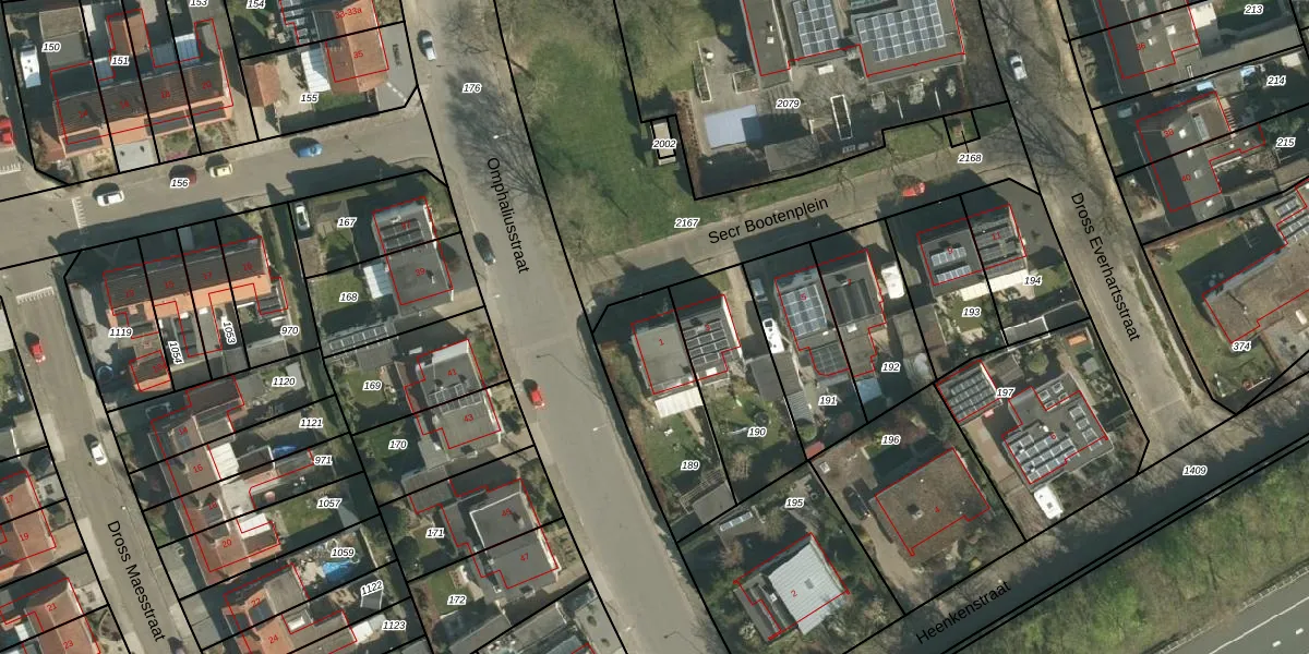 Secr Bootenplein 1 is gelegen op kadastraal perceel STE00G189. Deze kadastrale aanduiding is uniek en wordt gebruikt door het Kadaster om eigendomsrechten en andere zakelijke rechten vast te leggen. Het perceel maakt onderdeel uit van de kadastrale gemeente Stein.