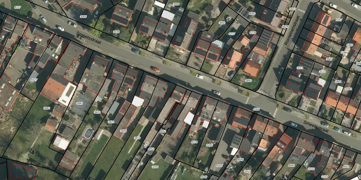 Het perceel waarop Smeetsstraat 65 staat heeft een oppervlakte van 330 m². Dit is een groot perceel. De perceeloppervlakte wordt geregistreerd door het Kadaster. Gedetailleerde informatie over de maten van dit perceel kunt u vinden in het rapport Kadastrale kaart met maatvoering van Smeetsstraat 65.
