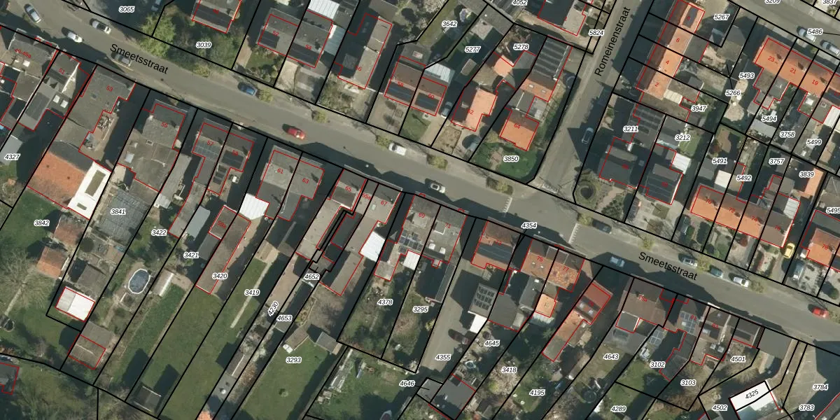 Het perceel waarop Smeetsstraat 69 staat heeft een oppervlakte van 382 m². Dit is een groot perceel. De perceeloppervlakte wordt geregistreerd door het Kadaster. Gedetailleerde informatie over de maten van dit perceel kunt u vinden in het rapport Kadastrale kaart met maatvoering van Smeetsstraat 69.