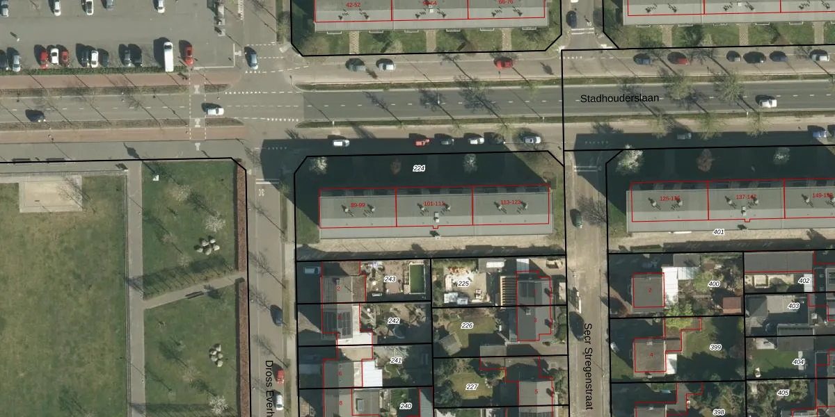 Stadhouderslaan 105 is gelegen op kadastraal perceel STE00G224. Deze kadastrale aanduiding is uniek en wordt gebruikt door het Kadaster om eigendomsrechten en andere zakelijke rechten vast te leggen. Het perceel maakt onderdeel uit van de kadastrale gemeente Stein.