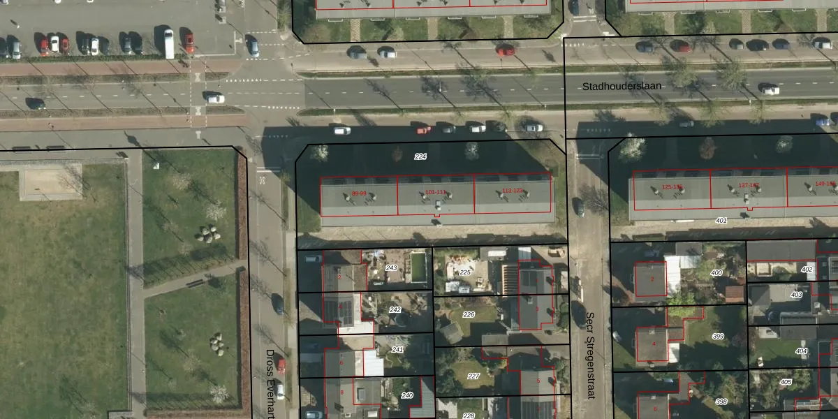 Stadhouderslaan 109 is gelegen op kadastraal perceel STE00G224. Deze kadastrale aanduiding is uniek en wordt gebruikt door het Kadaster om eigendomsrechten en andere zakelijke rechten vast te leggen. Het perceel maakt onderdeel uit van de kadastrale gemeente Stein.