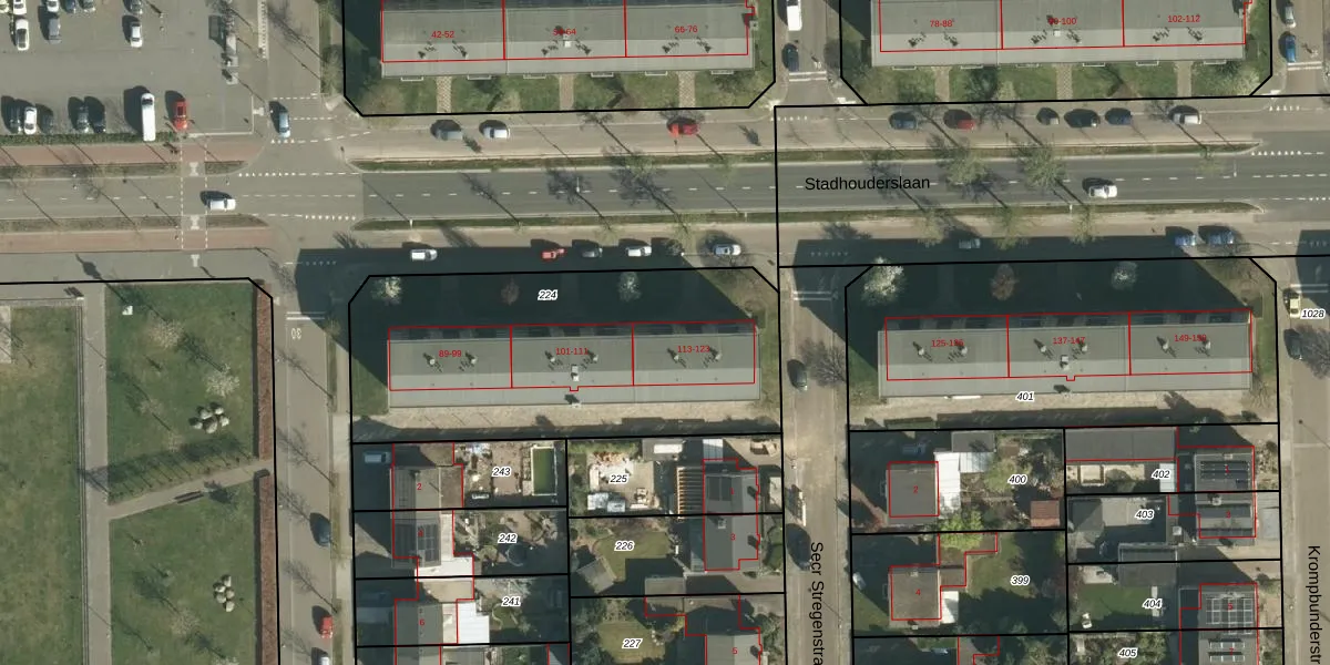 Stadhouderslaan 113 is gelegen op kadastraal perceel STE00G224. Deze kadastrale aanduiding is uniek en wordt gebruikt door het Kadaster om eigendomsrechten en andere zakelijke rechten vast te leggen. Het perceel maakt onderdeel uit van de kadastrale gemeente Stein.