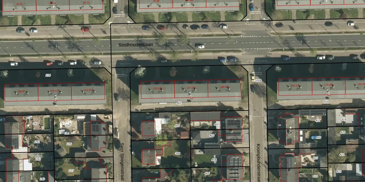 Stadhouderslaan 141 is gelegen op kadastraal perceel STE00G401. Deze kadastrale aanduiding is uniek en wordt gebruikt door het Kadaster om eigendomsrechten en andere zakelijke rechten vast te leggen. Het perceel maakt onderdeel uit van de kadastrale gemeente Stein.
