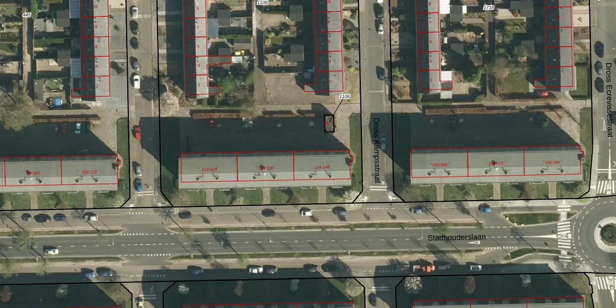 Stadhouderslaan 146 is gelegen op kadastraal perceel STE00G1105. Deze kadastrale aanduiding is uniek en wordt gebruikt door het Kadaster om eigendomsrechten en andere zakelijke rechten vast te leggen. Het perceel maakt onderdeel uit van de kadastrale gemeente Stein.