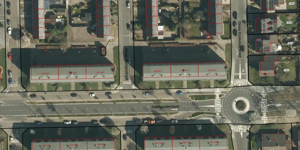 Stadhouderslaan 150 is gelegen op kadastraal perceel STE00G1718. Deze kadastrale aanduiding is uniek en wordt gebruikt door het Kadaster om eigendomsrechten en andere zakelijke rechten vast te leggen. Het perceel maakt onderdeel uit van de kadastrale gemeente Stein.