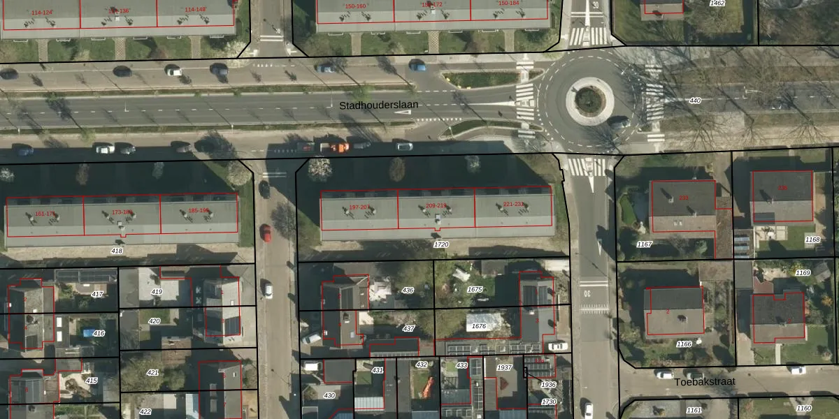 Stadhouderslaan 213 is gelegen op kadastraal perceel STE00G1720. Deze kadastrale aanduiding is uniek en wordt gebruikt door het Kadaster om eigendomsrechten en andere zakelijke rechten vast te leggen. Het perceel maakt onderdeel uit van de kadastrale gemeente Stein.