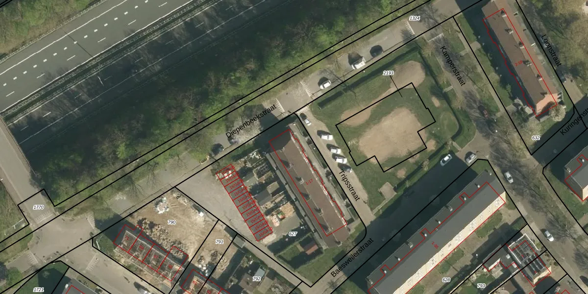 Het perceel waarop Tripsstraat 1 staat heeft een oppervlakte van 1930 m². Dit is een zeer groot perceel. De perceeloppervlakte wordt geregistreerd door het Kadaster. Gedetailleerde informatie over de maten van dit perceel kunt u vinden in het rapport Kadastrale kaart met maatvoering van Tripsstraat 1.