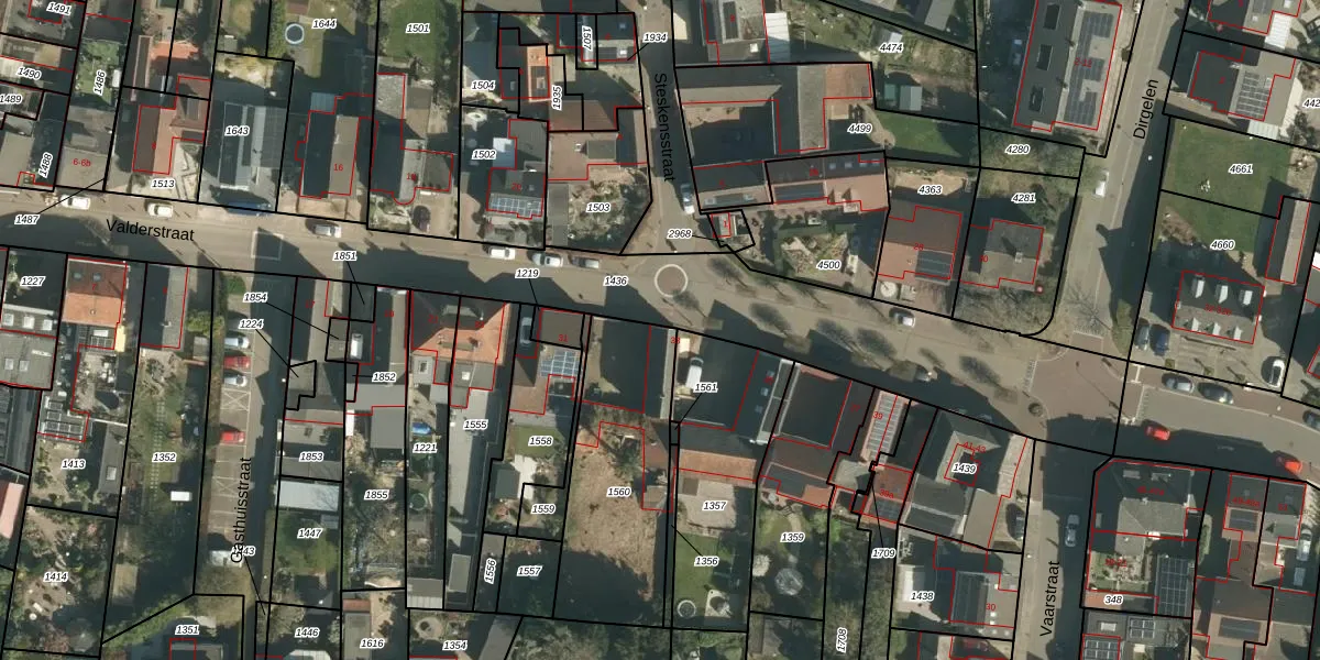 Valderstraat 33 is gelegen op kadastraal perceel STE00G1560. Deze kadastrale aanduiding is uniek en wordt gebruikt door het Kadaster om eigendomsrechten en andere zakelijke rechten vast te leggen. Het perceel maakt onderdeel uit van de kadastrale gemeente Stein.