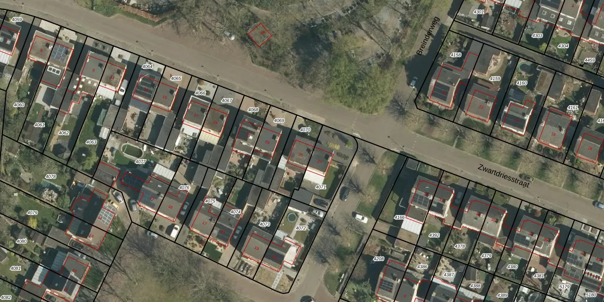 Het perceel waarop Zwartdriesstraat 25 staat heeft een oppervlakte van 241 m². Dit is een middelgroot perceel. De perceeloppervlakte wordt geregistreerd door het Kadaster. Gedetailleerde informatie over de maten van dit perceel kunt u vinden in het rapport Kadastrale kaart met maatvoering van Zwartdriesstraat 25.