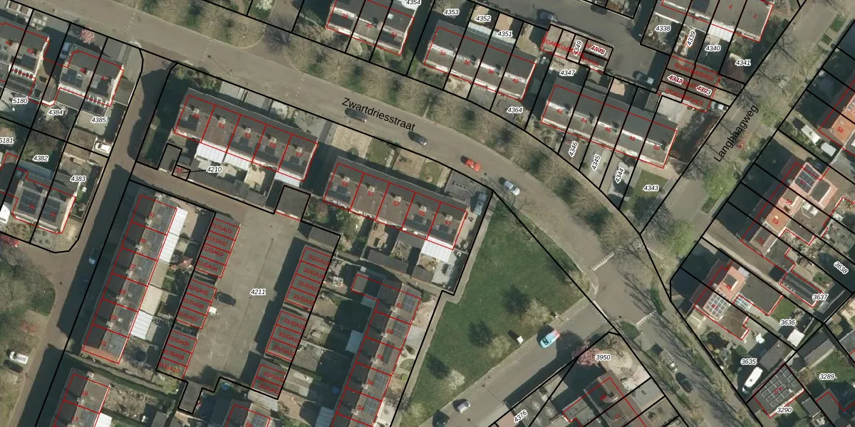 Het perceel waarop Zwartdriesstraat 65 staat heeft een oppervlakte van 7395 m². Dit is een zeer groot perceel. De perceeloppervlakte wordt geregistreerd door het Kadaster. Gedetailleerde informatie over de maten van dit perceel kunt u vinden in het rapport Kadastrale kaart met maatvoering van Zwartdriesstraat 65.