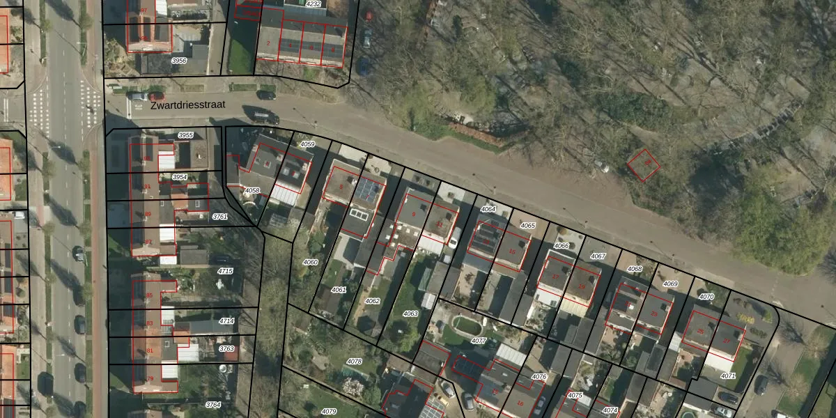 Het perceel waarop Zwartdriesstraat 9 staat heeft een oppervlakte van 385 m². Dit is een groot perceel. De perceeloppervlakte wordt geregistreerd door het Kadaster. Gedetailleerde informatie over de maten van dit perceel kunt u vinden in het rapport Kadastrale kaart met maatvoering van Zwartdriesstraat 9.