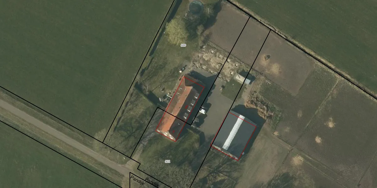 Het perceel waarop Pandijk 16-a staat heeft een oppervlakte van 3165 m². Dit is een zeer groot perceel. De perceeloppervlakte wordt geregistreerd door het Kadaster. Gedetailleerde informatie over de maten van dit perceel kunt u vinden in het rapport Kadastrale kaart met maatvoering van Pandijk 16-a.