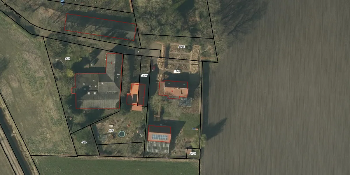 Het perceel waarop Vonderweg 5 staat heeft een oppervlakte van 1655 m². Dit is een zeer groot perceel. De perceeloppervlakte wordt geregistreerd door het Kadaster. Gedetailleerde informatie over de maten van dit perceel kunt u vinden in het rapport Kadastrale kaart met maatvoering van Vonderweg 5.