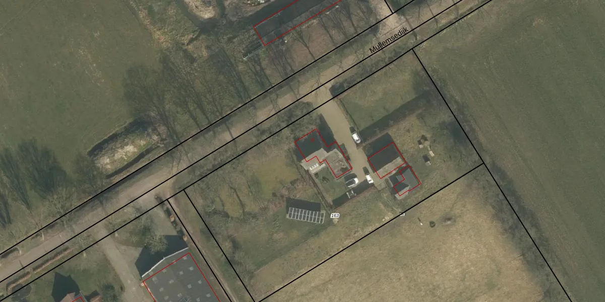 Het perceel waarop Mullemsedijk 13 staat heeft een oppervlakte van 3955 m². Dit is een zeer groot perceel. De perceeloppervlakte wordt geregistreerd door het Kadaster. Gedetailleerde informatie over de maten van dit perceel kunt u vinden in het rapport Kadastrale kaart met maatvoering van Mullemsedijk 13.