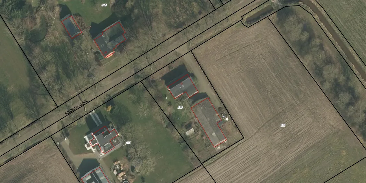 Het perceel waarop Mullemsedijk 17 staat heeft een oppervlakte van 1640 m². Dit is een zeer groot perceel. De perceeloppervlakte wordt geregistreerd door het Kadaster. Gedetailleerde informatie over de maten van dit perceel kunt u vinden in het rapport Kadastrale kaart met maatvoering van Mullemsedijk 17.