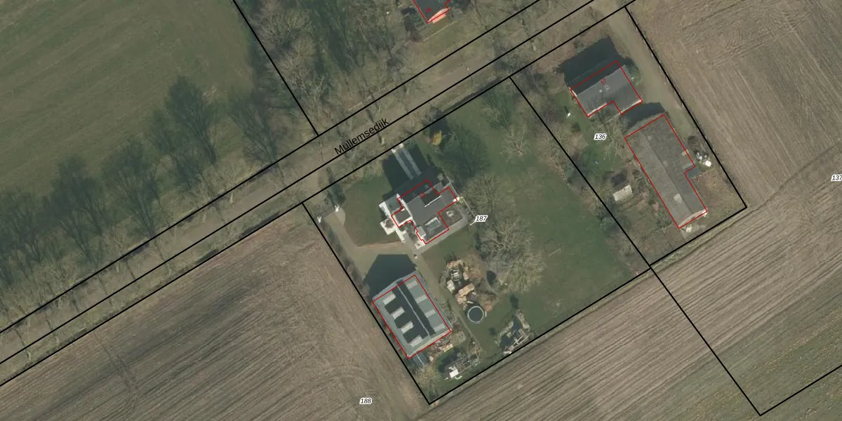 Mullemsedijk 19 is gelegen op kadastraal perceel OLO00R187. Deze kadastrale aanduiding is uniek en wordt gebruikt door het Kadaster om eigendomsrechten en andere zakelijke rechten vast te leggen. Het perceel maakt onderdeel uit van de kadastrale gemeente Oploo.