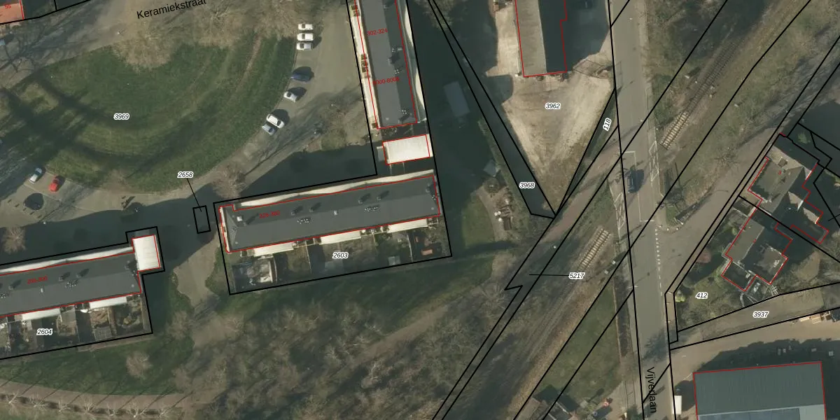 Keramiekstraat 350 is gelegen op kadastraal perceel TGL00D2603. Deze kadastrale aanduiding is uniek en wordt gebruikt door het Kadaster om eigendomsrechten en andere zakelijke rechten vast te leggen. Het perceel maakt onderdeel uit van de kadastrale gemeente Tegelen.