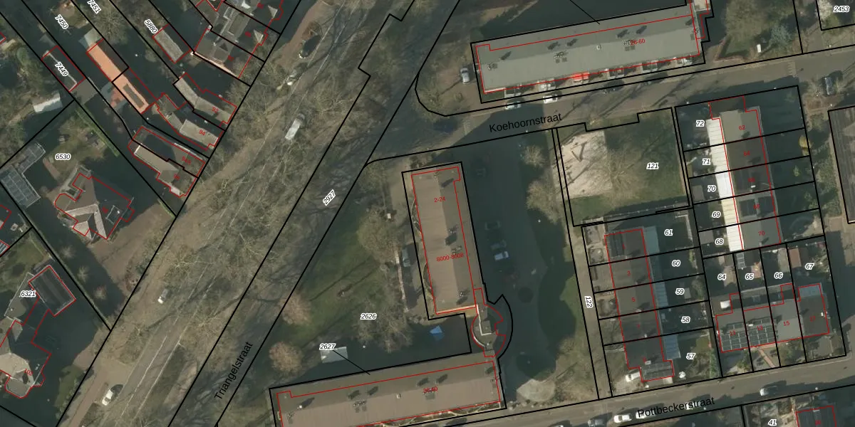 Koehoornstraat 8 is gelegen op kadastraal perceel TGL00D2627. Deze kadastrale aanduiding is uniek en wordt gebruikt door het Kadaster om eigendomsrechten en andere zakelijke rechten vast te leggen. Het perceel maakt onderdeel uit van de kadastrale gemeente Tegelen.