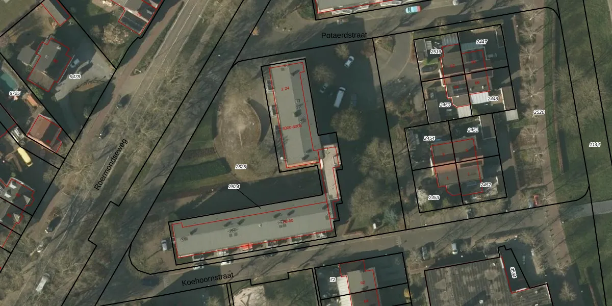 Potaerdstraat 2 is gelegen op kadastraal perceel TGL00D2624. Deze kadastrale aanduiding is uniek en wordt gebruikt door het Kadaster om eigendomsrechten en andere zakelijke rechten vast te leggen. Het perceel maakt onderdeel uit van de kadastrale gemeente Tegelen.