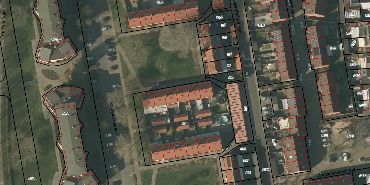 Het perceel waarop Romeinenstraat 57 staat heeft een oppervlakte van 1943 m². Dit is een zeer groot perceel. De perceeloppervlakte wordt geregistreerd door het Kadaster. Gedetailleerde informatie over de maten van dit perceel kunt u vinden in het rapport Kadastrale kaart met maatvoering van Romeinenstraat 57.