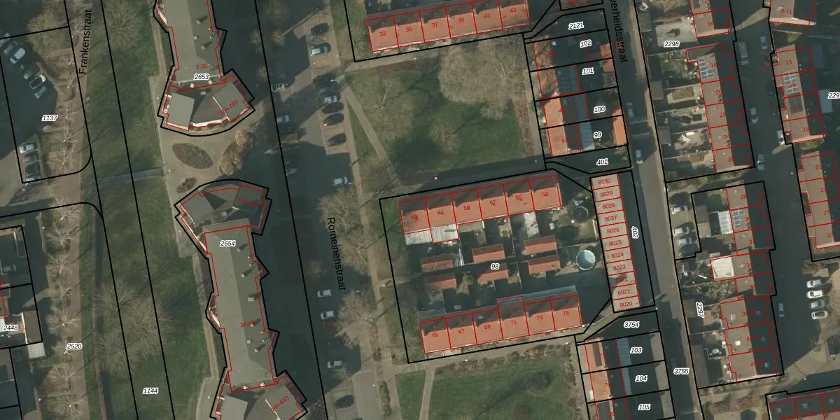 Het perceel waarop Romeinenstraat 63 staat heeft een oppervlakte van 1943 m². Dit is een zeer groot perceel. De perceeloppervlakte wordt geregistreerd door het Kadaster. Gedetailleerde informatie over de maten van dit perceel kunt u vinden in het rapport Kadastrale kaart met maatvoering van Romeinenstraat 63.