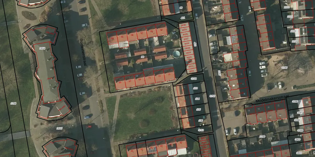 Het perceel waarop Romeinenstraat 73 staat heeft een oppervlakte van 1943 m². Dit is een zeer groot perceel. De perceeloppervlakte wordt geregistreerd door het Kadaster. Gedetailleerde informatie over de maten van dit perceel kunt u vinden in het rapport Kadastrale kaart met maatvoering van Romeinenstraat 73.