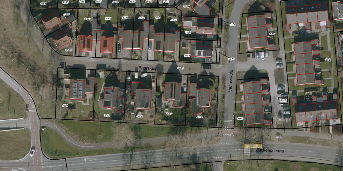 Het perceel waarop Boarskulp 3 staat heeft een oppervlakte van 539 m². Dit is een groot perceel. De perceeloppervlakte wordt geregistreerd door het Kadaster. Gedetailleerde informatie over de maten van dit perceel kunt u vinden in het rapport Kadastrale kaart met maatvoering van Boarskulp 3.