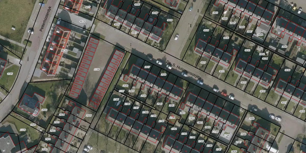Gebruik de zoekbalk of klik op een perceel voor informatie over de adressen binnen dit perceel.