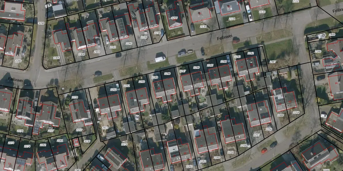 Het perceel waarop Felixwei 70 staat heeft een oppervlakte van 244 m². Dit is een middelgroot perceel. De perceeloppervlakte wordt geregistreerd door het Kadaster. Gedetailleerde informatie over de maten van dit perceel kunt u vinden in het rapport Kadastrale kaart met maatvoering van Felixwei 70.
