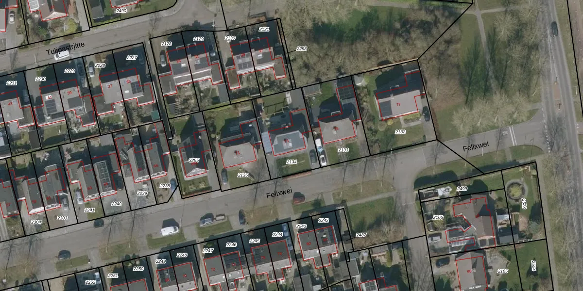 Het perceel waarop Felixwei 73 staat heeft een oppervlakte van 497 m². Dit is een groot perceel. De perceeloppervlakte wordt geregistreerd door het Kadaster. Gedetailleerde informatie over de maten van dit perceel kunt u vinden in het rapport Kadastrale kaart met maatvoering van Felixwei 73.
