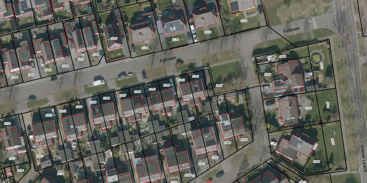 Het perceel waarop Felixwei 80 staat heeft een oppervlakte van 213 m². Dit is een middelgroot perceel. De perceeloppervlakte wordt geregistreerd door het Kadaster. Gedetailleerde informatie over de maten van dit perceel kunt u vinden in het rapport Kadastrale kaart met maatvoering van Felixwei 80.