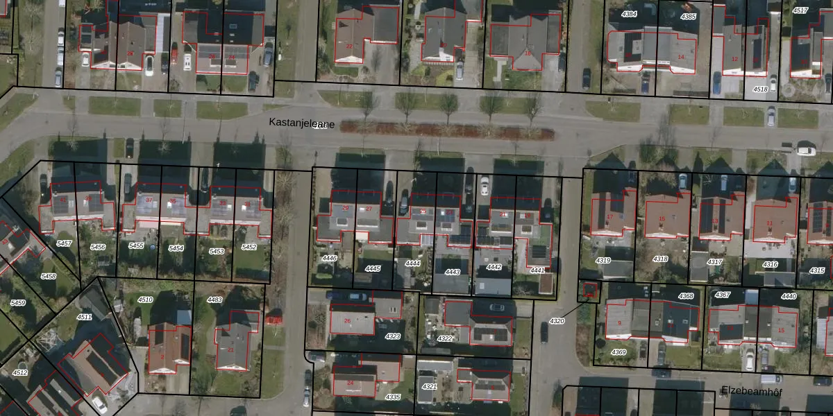 Kastanjeleane 25 is gelegen op kadastraal perceel HUM00B4444. Deze kadastrale aanduiding is uniek en wordt gebruikt door het Kadaster om eigendomsrechten en andere zakelijke rechten vast te leggen. Het perceel maakt onderdeel uit van de kadastrale gemeente Hijum.