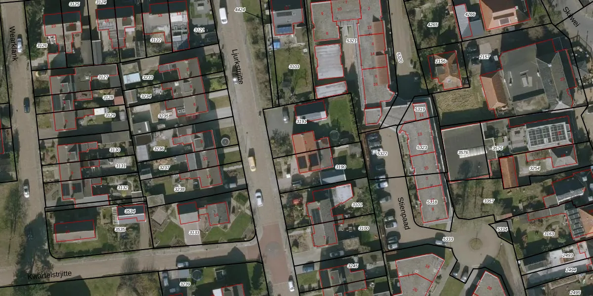 Het perceel waarop Ljurkstrjitte 1 staat heeft een oppervlakte van 507 m². Dit is een groot perceel. De perceeloppervlakte wordt geregistreerd door het Kadaster. Gedetailleerde informatie over de maten van dit perceel kunt u vinden in het rapport Kadastrale kaart met maatvoering van Ljurkstrjitte 1.