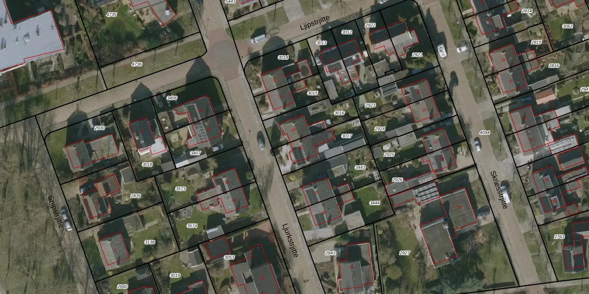 Ljurkstrjitte 45 is gelegen op kadastraal perceel HUM00B3017. Deze kadastrale aanduiding is uniek en wordt gebruikt door het Kadaster om eigendomsrechten en andere zakelijke rechten vast te leggen. Het perceel maakt onderdeel uit van de kadastrale gemeente Hijum.
