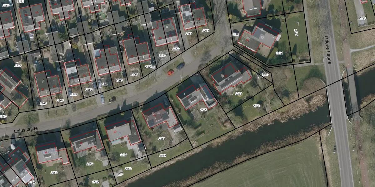 Lotusstrjitte 54 is gelegen op kadastraal perceel HUM00D2555. Deze kadastrale aanduiding is uniek en wordt gebruikt door het Kadaster om eigendomsrechten en andere zakelijke rechten vast te leggen. Het perceel maakt onderdeel uit van de kadastrale gemeente Hijum.