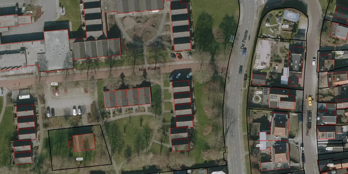 Nije Poarte 1 is gelegen op kadastraal perceel HUM00B3801. Deze kadastrale aanduiding is uniek en wordt gebruikt door het Kadaster om eigendomsrechten en andere zakelijke rechten vast te leggen. Het perceel maakt onderdeel uit van de kadastrale gemeente Hijum.
