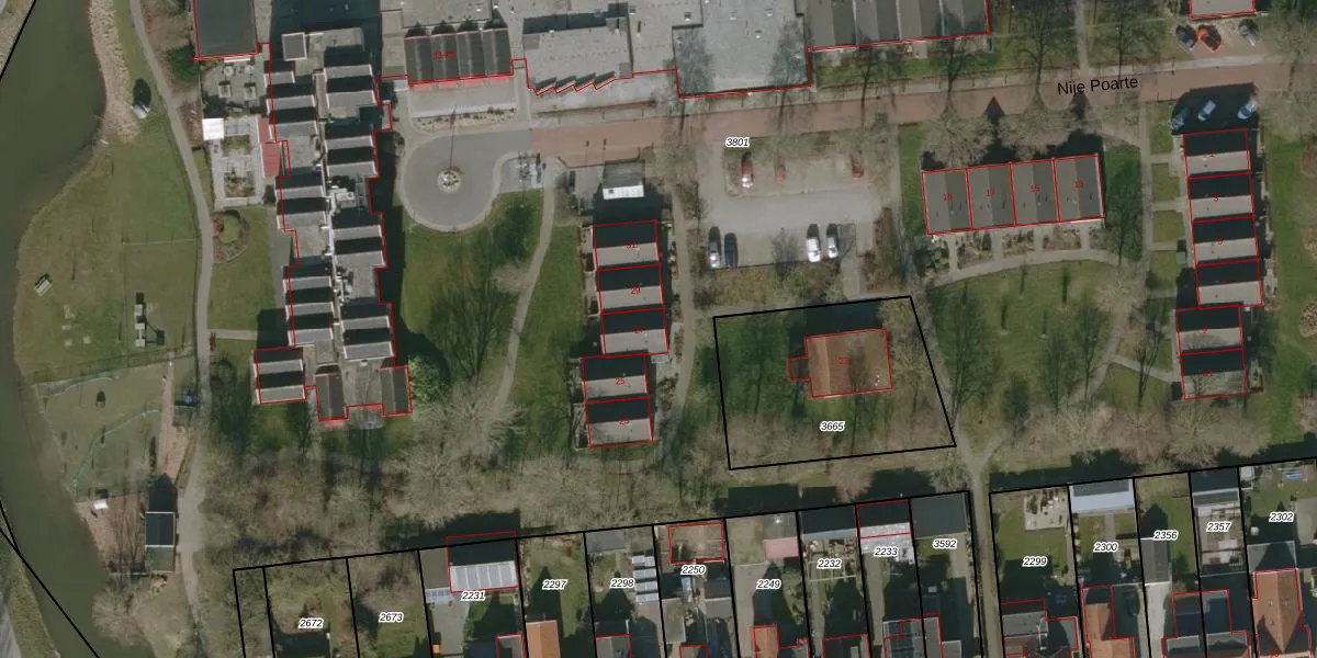Het perceel waarop Nije Poarte 27 staat heeft een oppervlakte van 2,8 ha. Dit is een zeer groot perceel. De perceeloppervlakte wordt geregistreerd door het Kadaster. Gedetailleerde informatie over de maten van dit perceel kunt u vinden in het rapport Kadastrale kaart met maatvoering van Nije Poarte 27.