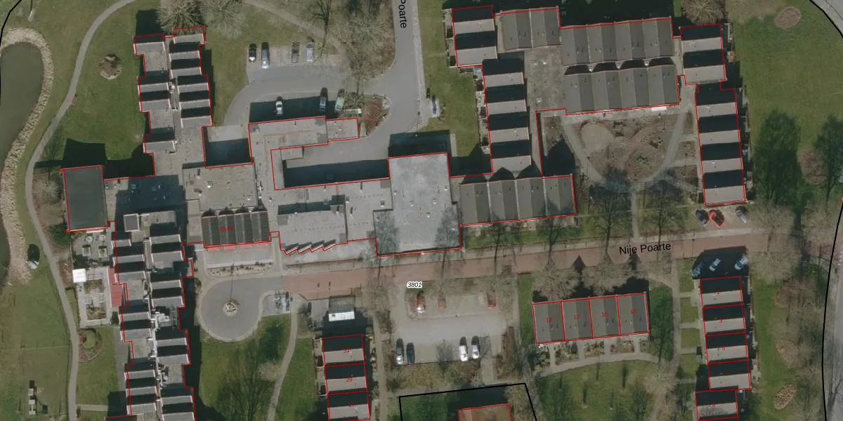 Het perceel waarop Nije Poarte 45 staat heeft een oppervlakte van 2,8 ha. Dit is een zeer groot perceel. De perceeloppervlakte wordt geregistreerd door het Kadaster. Gedetailleerde informatie over de maten van dit perceel kunt u vinden in het rapport Kadastrale kaart met maatvoering van Nije Poarte 45.
