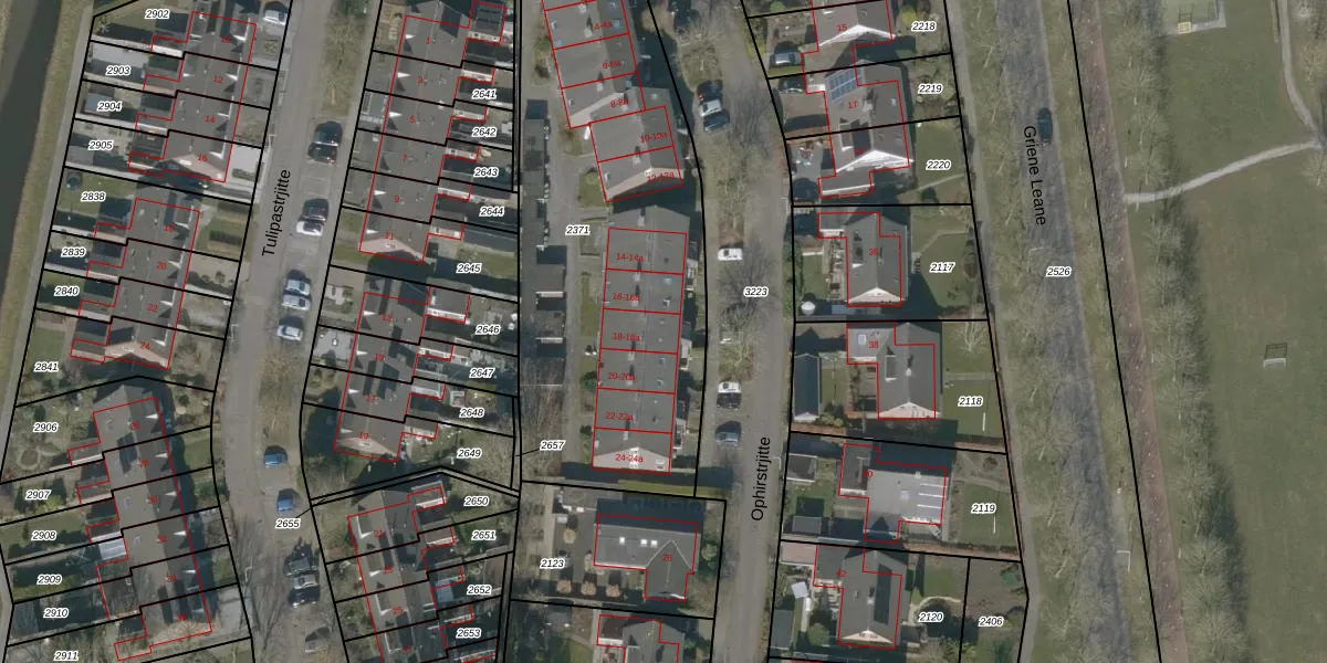 Het perceel waarop Ophirstrjitte 18-a staat heeft een oppervlakte van 2092 m². Dit is een zeer groot perceel. De perceeloppervlakte wordt geregistreerd door het Kadaster. Gedetailleerde informatie over de maten van dit perceel kunt u vinden in het rapport Kadastrale kaart met maatvoering van Ophirstrjitte 18-a.